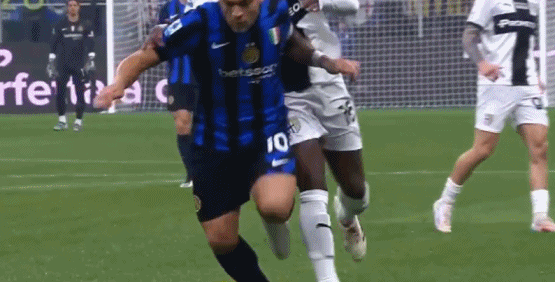 比赛第11分钟,国米前锋劳塔罗禁区被推倒,裁判先是判给主队点球,随后经过VAR视频助理裁判提示,裁判改判禁区外任意球。